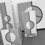 Scala di orologi da parete o da scrivania, design a cerchi concentrici con colorazioni contrapposte. Lo stesso design viene applicato su diversi oggetti a seconda delle esigenze: vasi, cofanetti, portasalviette, portapenne, ecc…