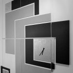 Elemento decorativo che nasconde la praticità di un armadio guardaroba a scomparsa. Semplici riquadri compongono disegni schematici sviluppati su diversi spessori, effetti colore accompagnati da finiture metalliche.