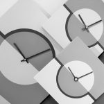 Scala di orologi da parete o da scrivania, design a cerchi concentrici con colorazioni contrapposte. Lo stesso design viene applicato su diversi oggetti a seconda delle esigenze: vasi, cofanetti, portasalviette, portapenne, ecc…