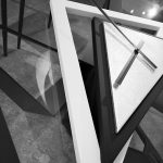 Elemento decorativo composto da tre triangoli agganciati con corpo centrale completo di orologio, pratico ed eccentrico da portare a spalla.