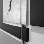 Elemento decorativo che nasconde la praticità di un armadio guardaroba a scomparsa. Semplici riquadri compongono disegni schematici sviluppati su diversi spessori, effetti colore accompagnati da finiture metalliche.